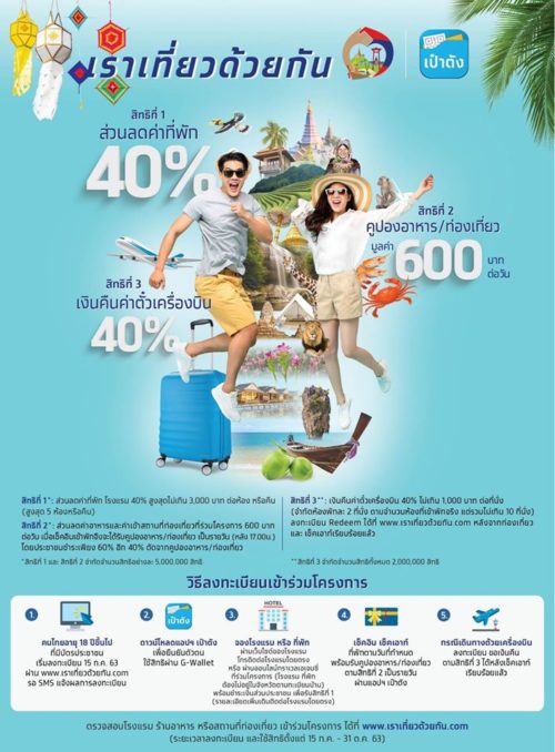 - ชำระค่าที่พักผ่านแอป เป๋าตัง ไม่น้อยกว่า 60% ของค่าที่พัก (โดยรัฐจะสนับสนุนค่าที่พัก 40% หรือไม่เกิน 3,000 บาทต่อห้องหรือต่อคืน