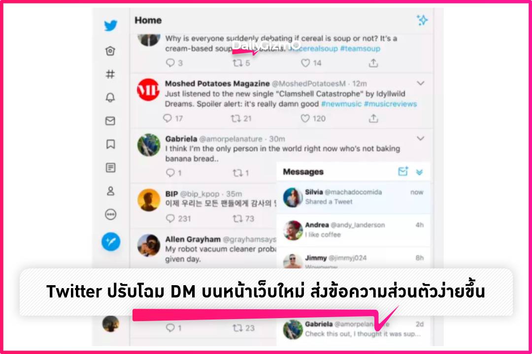 Twitter เผยโฉมอินเทอร์เฟซใหม่ของ DM บนหน้าเว็บ ช่วยให้เราส่งหรือเปิดอ่านข้อความส่วนตัวได้โดยไม่จำเป็นต้องออกจากหน้าไทม์ไลน์