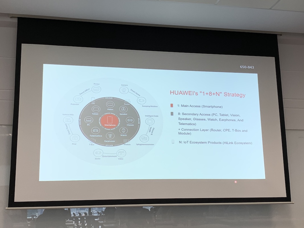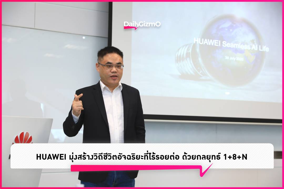 โดยตัวเลขและตัวอักษรในกลยุทธ์ 1+8+N สะท้อนถึงการเชื่อมต่อแบบบูรณาการของสมาร์ทดีไวซ์ ภายในอีโคซิสเต็มของหัวเว่ย โดยเลข 1 หมายถึง สมาร์ทโฟน หรืออุปกรณ์หลักที่จะเป็นหัวใจในการเชื่อมต่อและควบคุมการทำงานของดีไวซ์อื่นๆ ขณะที่ 8 หมายถึง สมาร์ทดีไวซ์อื่นๆ อีก 8 อย่างที่จะเชื่อมต่อกับสมาร์ทโฟน ได้แก่ แล็ปท็อป แท็บเล็ต สมาร์ทวอทช์ หูฟังไร้สาย แว่นตา ทีวีหรือหน้าจออัจฉริยะ ลำโพง และรถยนต์ ส่วน N หมายถึง อินเทอร์เน็ตในทุกสรรพสิ่ง (IoT) และเครื่องหมาย “+” หมายถึง เครือข่ายการเชื่อมต่อในบริเวณกว้าง (WAN) และเทคโนโลยีการเชื่อมต่อระยะใกล้ เช่น Huawei Share และ HiLink โดยมี Router, CPE, T-Box และ Module ที่จะผสานเครือข่ายอีโคซิสเต็มของหัวเว่ยให้สมบูรณ์ เพื่อมอบประสบการณ์การทำงานที่ลื่นไหล เต็มประสิทธิภาพ และให้ชีวิตเอไอ ไร้รอยต่อเกิดขึ้นได้อย่างเป็นรูปธรรมผ่านการใช้งานจริงบนสมาร์ทดีไวซ์ต่างๆ ของหัวเว่ยในชีวิตประจำวัน