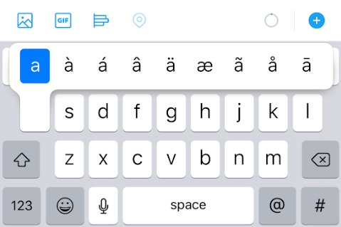แต่เวลาที่เราอยากจะใช้ตัวอัษรพิเศษมองไปบนแป้นพิมพ์ไม่มีก็เลยไม่รู้จะไปหาใช้งานจากไหน ซึ่งสิ่งที่หลายคนไม่รู้ก็คือ บางตัวอักษรนั้นจะมีตัวอักษรหรือสัญลักษณ์พิเศษซ่อนไว้ ยกตัวอย่างแป้นพิมพ์ของ iPhone ถ้าเรากดที่ตัว a ค้างไว้จะมีแถวใหม่ป็อปอัพขึ้นมาด้านบนให้เลือกดังภาพด้านล่าง
