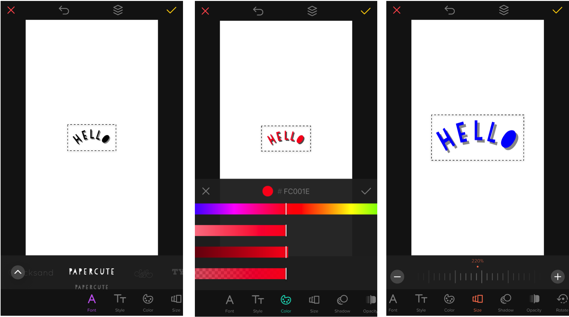 พอได้รูปหรือวิดีโอที่เราต้องการ เราก็แค่พิมพ์ข้อความ แล้วปรับเปลี่ยนรูปแบบ Font ตามที่ต้องการ หลังจากนั้นเรายังปรับหรือตกแต่ง Font เพื่อเพิ่มความสวยงาม และไม่เหมือนใครได้ตามแถบเมนูด้านล่างเลยทั้งปรับสี ปรับขนาด เพิ่มแสงเงา