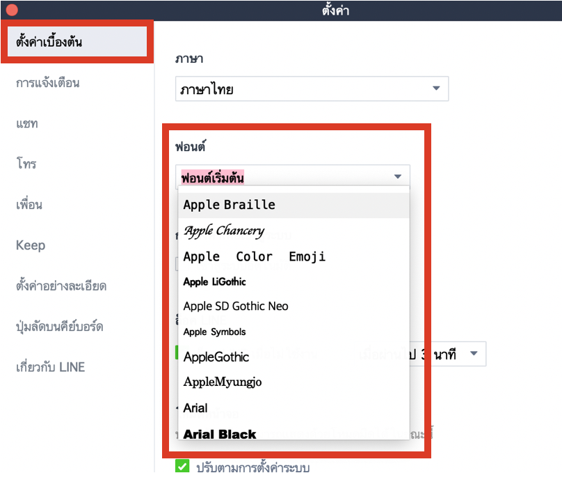จากนั้นไปที่ ตั้งค่าเบื้องต้น แล้วจะเห็นคำว่า ฟอนต์ ให้เราเลื่อนเพื่อเลือกรูปแบบฟอนต์ที่เราต้องการ แค่นี้ไลน์ของเราก็จะเปลี่ยนเป็นฟอนต์เก๋ ๆ ได้แล้ว