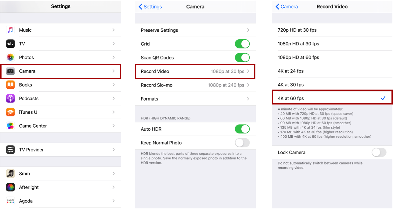 จากนั้นให้เลือกไปที่ 4K at 60 fps เลย โดยปกติเครื่องเราจะปรับไว้ให้ที่ 1080p ที่ 30 fps หรือ 60 fps