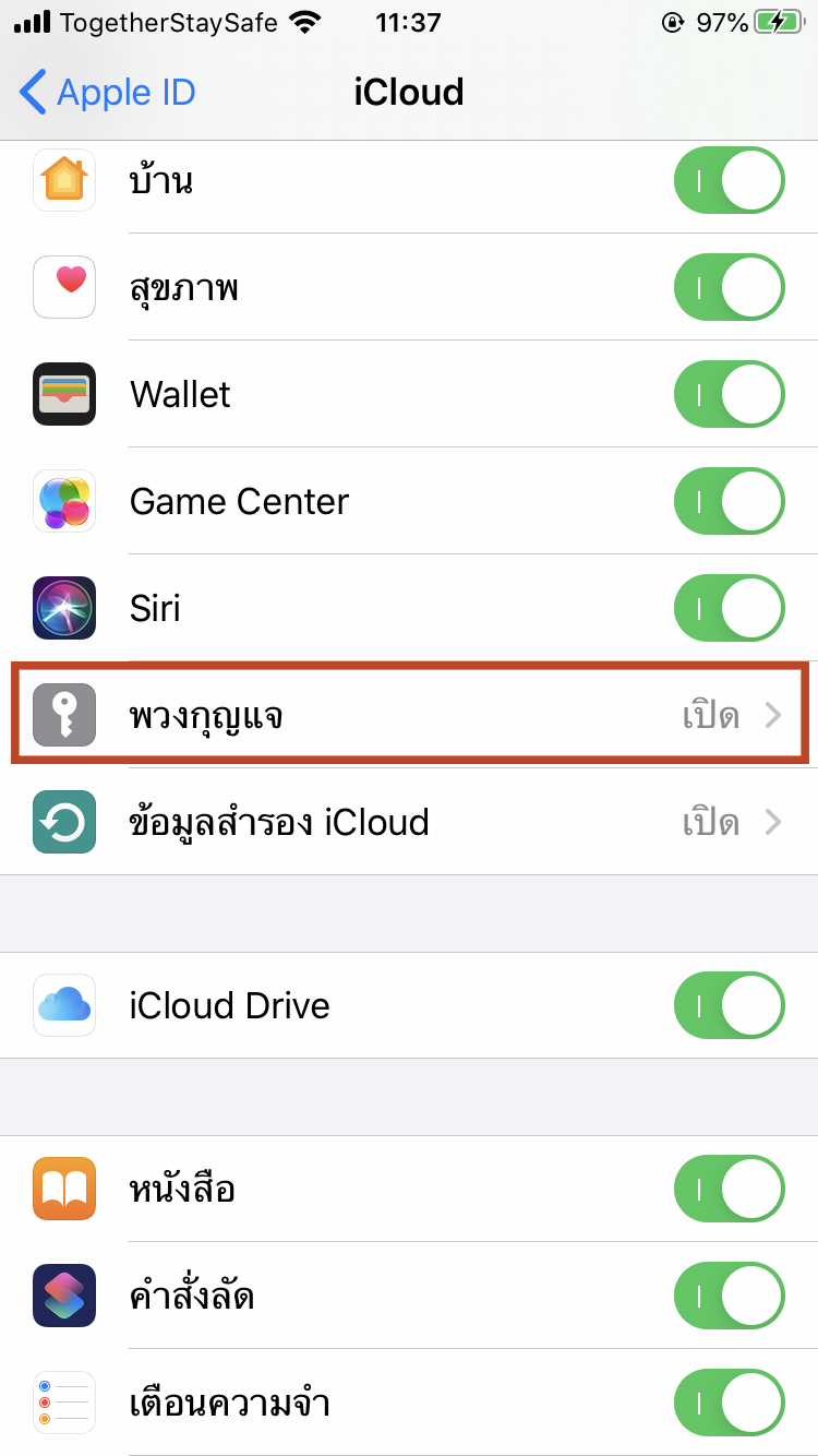 2.แตะ พวงกุญแจ (iCloud Keychain) > เปิด พวงกุญแจ (iCloud) เท่านี้ก็เป็นอันเสร็จครับ