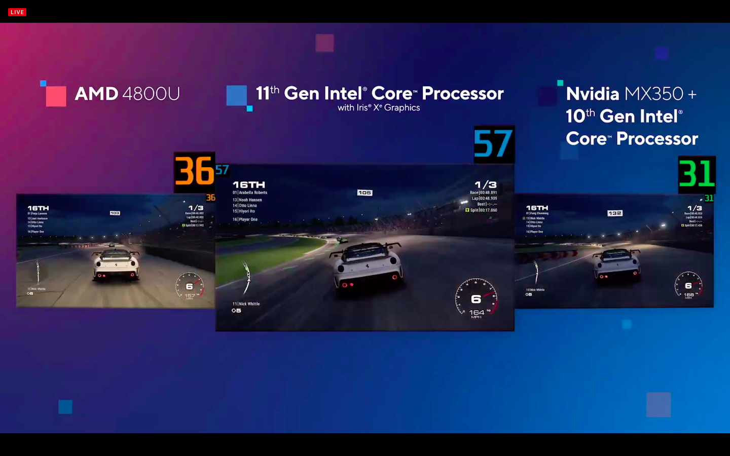 - กราฟิก Intel Iris Xe ใหม่มีประสิทธิภาพเหนือกว่าร้อยละ 90 ของบรรดาการ์ดจอแยกที่นำมาจับคู่เพื่อใช้งานในเซ็กเมนต์นี้ และมอบประสิทธิภาพสูงสุด 96 EUs และสูงสุด 16MB ของ L3 cache