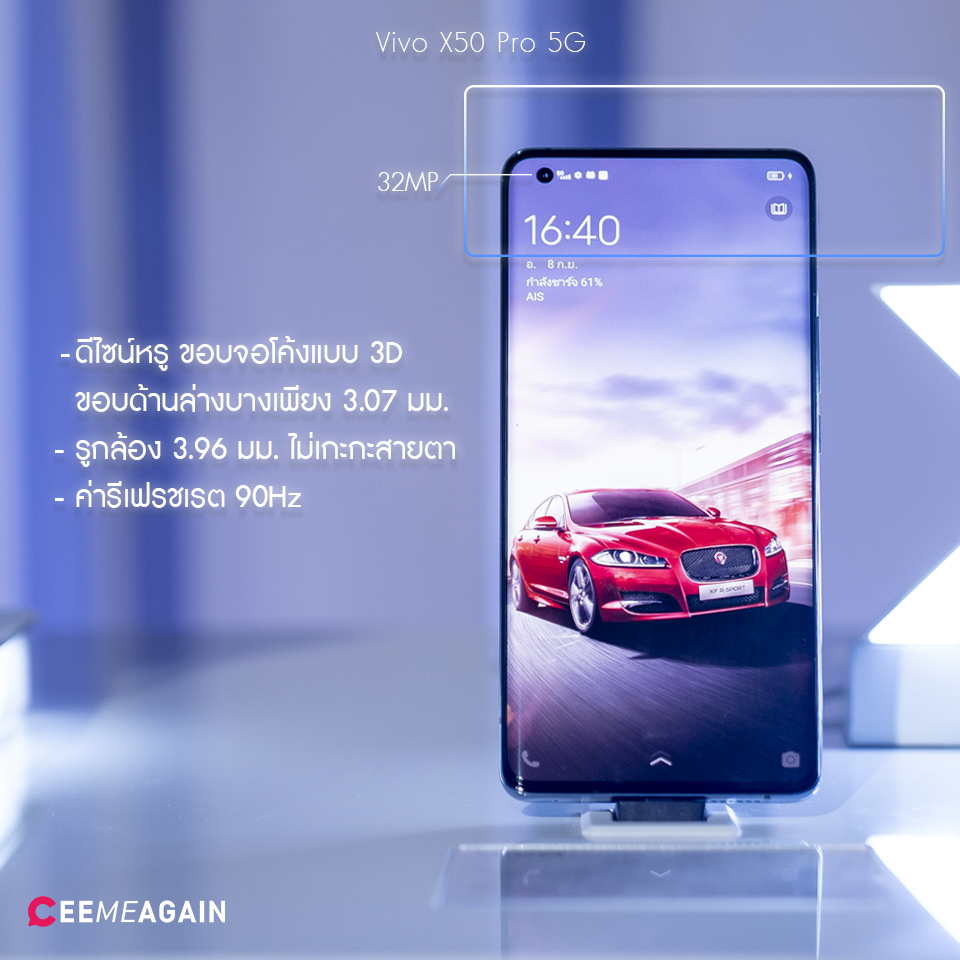 ต้องบอกเลยว่าตัวเครื่องของ Vivo X50 Pro ออกแบบได้สวยงามและดูพรีเมี่ยมเป็นอย่างมาก ตัวเครื่องไล่โทนสีออกมาได้อย่างนุ่มนวล ใช้หน้าจอแบบขอบโค้ง ทำให้อัตราส่วนของหน้าจอมีขนาดใหญ่มากยิ่งขึ้น ขอบจอที่ด้านล่างของตัวเครื่องบางเพียง 3.07 มม. เท่านั้น ตัวหน้าจอเองเป็นแบบ AMOLED ขนาด 6.56 นิ้ว ค่ารีเฟรชเรตสูงถึง 90Hz และใช้ชิปเสียง AK4377A คุณภาพเสียง Hi-Fi แถมยังแบตเตอรี่ 4,315 mAh รองรับชาร์จไว 33 วัตต์อีกด้วย