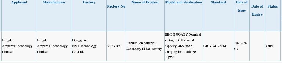 Galaxy S21+ มาพร้อมแบตเตอรี่ขนาดความจุ 4800 mAh เรียกว่าเพิ่มขึ้นจากเดิม 4500mAh โดยภาพแบตเตอรี่นี้ทาง Mysmartprice ได้มาจากหน่วยงานของเกาหลีที่รับผิดชอบ ซึ่งแบตเตอรี่จะมีรหัสว่า EB-BG996ABY (สำหรับ SM-G996 หรือ Galaxy S21+)
