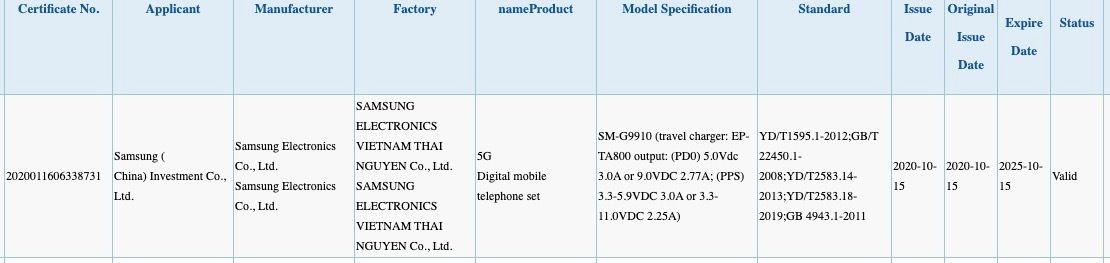 ในเว็บ 3C รายงานว่า Galaxy S21 (เลขโมเดล SM-G9910) จะรองรับการชาร์จ 25W (11.0VDC, 2.25A) รวมถึงรองรับการเชื่อมต่อ 5G