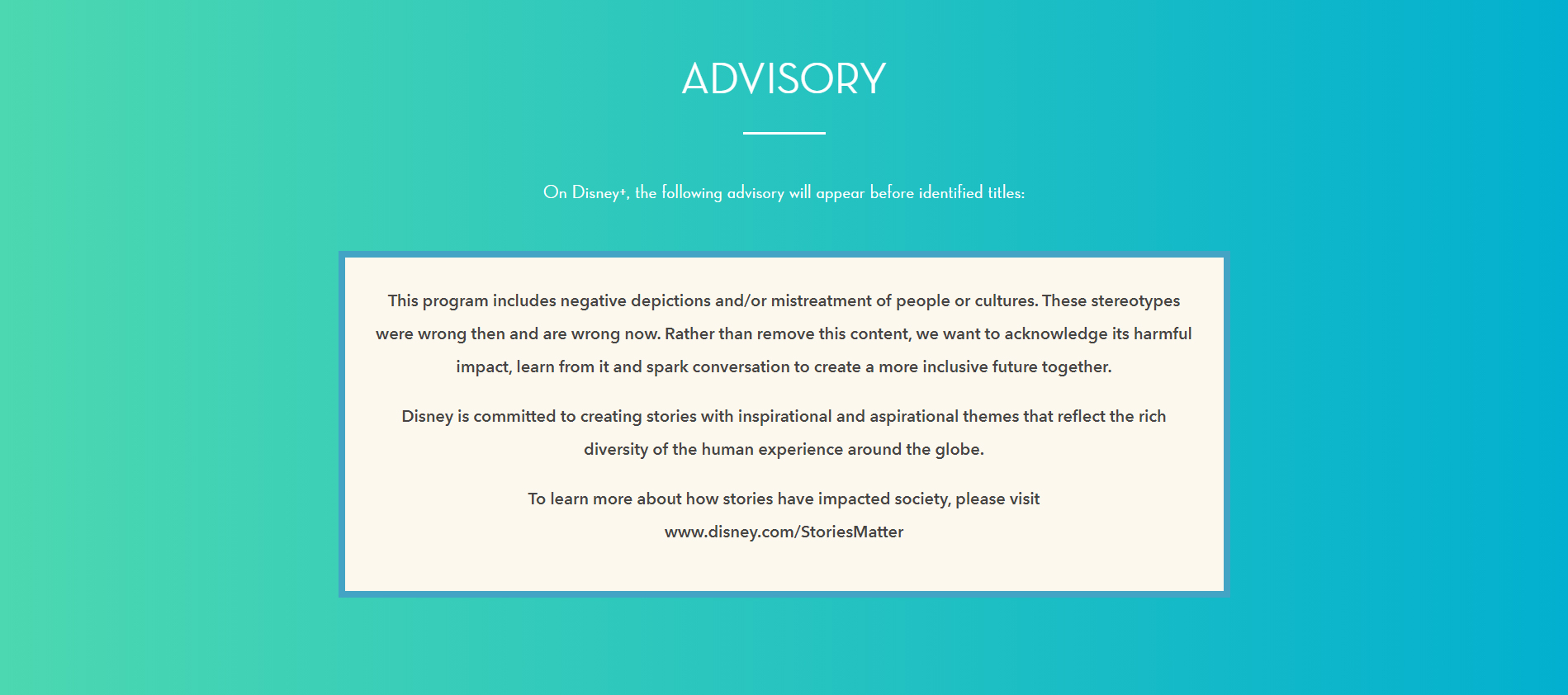 ทั้งนี้ทาง Disney จึงได้ทำการเพิ่มการแสดงคำเตือนเนื้อหาเป็นคลิปสั้นบน Disney+ ความยาว 12 วินาทีก่อนที่ผู้ชมจะได้รับชมเนื้อหาโดยที่กดข้ามไม่ได้ ซึ่งทาง Disney ก็ได้มีการแทรกลิงก์ไปยังเว็บไซต์ Stories Matter ที่มีการอธิบายว่าทำไมการพูดถึงตัวละครบางตัวถึงมีความไม่เหมาะสม และระบุตัวอย่างหนังที่ดิสนีย์จะใส่คลิปคำเตือนลงไปเพื่อเพิ่มความเข้าใจมากขึ้นให้กับผู้ชมหรือผู้ปกครอง
