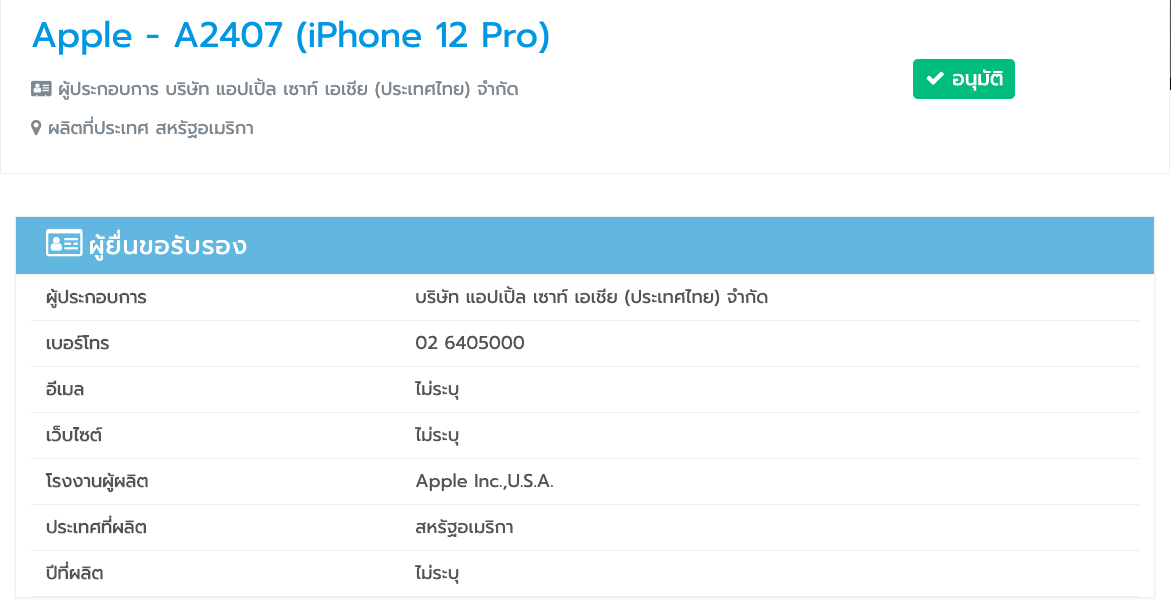 โดย iPhone 12 มีรัหสอนุมัติคือ A 2403 ส่วน iPhone 12 Pro จะมีรหัสอนุมัติคือ A2407