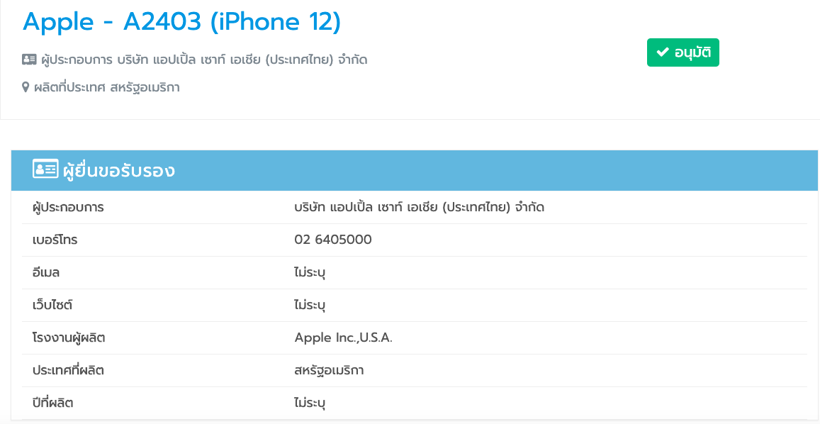 สำนักงาน กสทช. นั้นจะเป็นหน่วยงานที่ทำการตรวจสอบอุปกรณ์ที่ส่งสัญญาณวิทยุตามกฎหมายก่อนที่จะนำเข้ามาวางขายในประเทศไทย ล่าสุดเมื่อเข้าไปตรวจสอบข้อมูลที่ผ่านการอนุมัติบนหน้าเว็บ Mocheck พบว่าตอนนี้มี iPhone 12 ที่ผ่านการตรวจสอบแล้วจำนวน 2 รุ่น คือ iPhone 12 และ iPhone 12 Pro