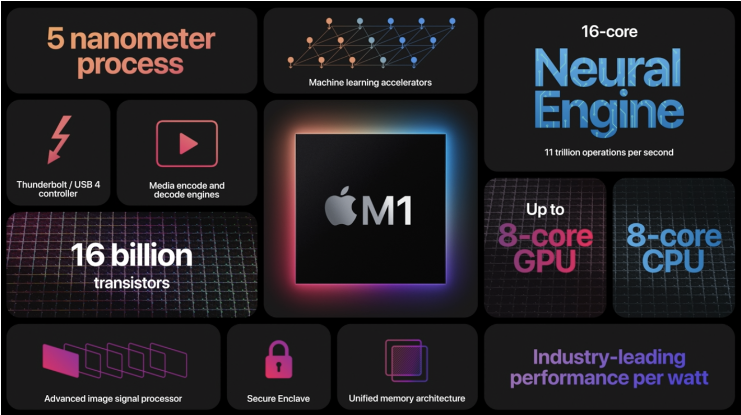 ชิป M1 นั้นเรียกว่าเป็น SOC ที่รวมทุกอย่างเอาไว้ในชิปตัวเดียว ไม่ว่าจะเป็น CPU, GPU, Neural Engine,   หน่วยความจำ, ความปลอดภัยเป็นต้น ตัวบนสถาปัตยกรรม 5 นาโนเมตรที่ประกอบด้วยทรานซิสเตอร์มากถึง 16,000 ล้านตัวทำให้การประมวลผลเร็วขึ้นกว่าเดิม