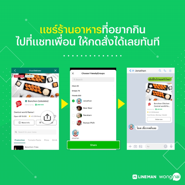 - แชร์ร้านอาหารให้เพื่อนง่าย: กดปุ่มแชร์ที่หน้าร้านอาหารที่อยากกิน เพื่อส่งต่อให้เพื่อนหรือคนในครอบครัวผ่านแชท แล้วเพื่อนสามารถกดสั่งจากแชทได้เลยทันที