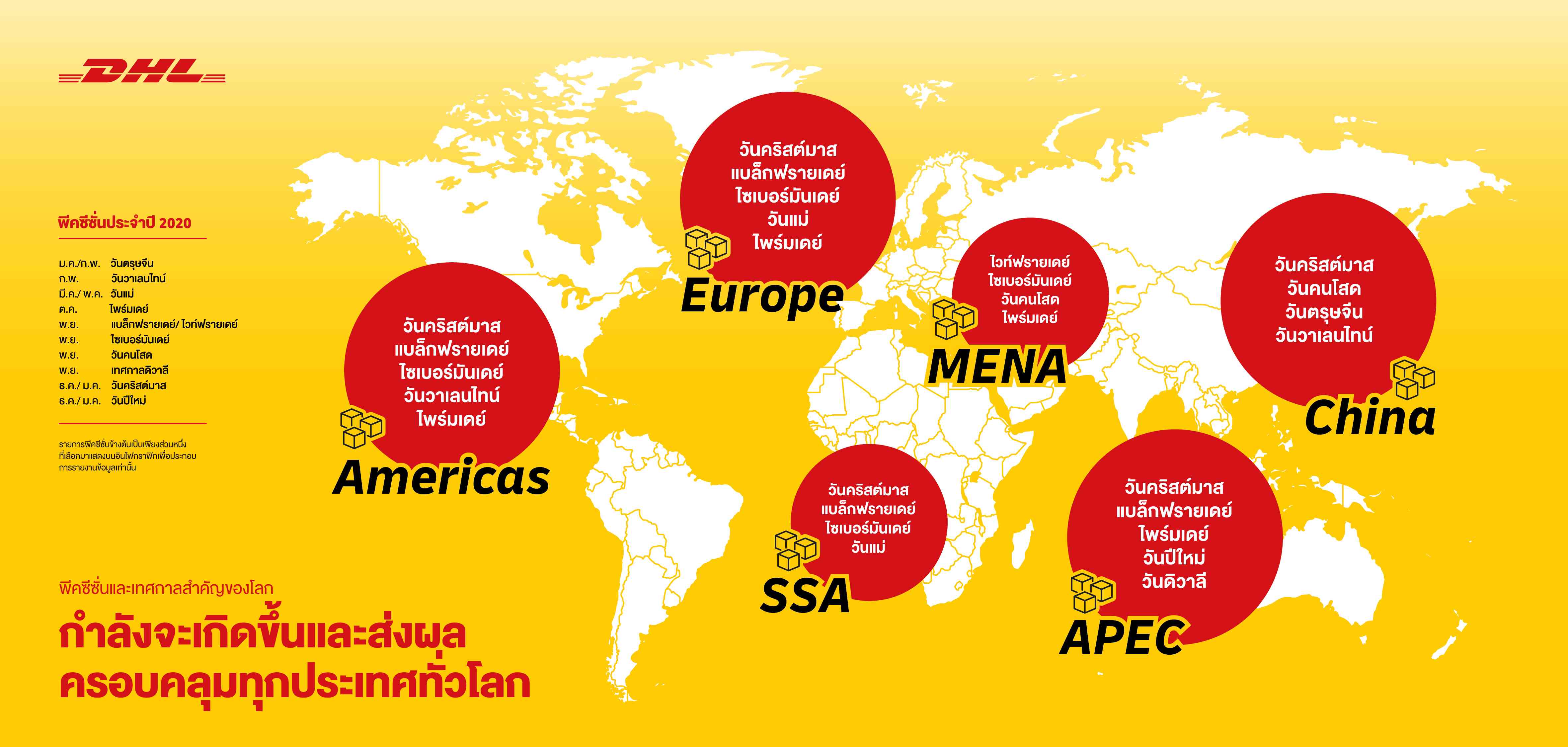ทั้งนี้ บริษัทฯ คาดว่าจะมียอดขนส่งสินค้าระหว่างประเทศในภูมิภาคเอเชียแปซิฟิกเพิ่มขึ้นราว 40% ขณะที่ประเทศไทยจะมียอดขนส่งสินค้าระหว่างประเทศเพิ่มขึ้น 30% ในช่วงพีคซีซั่นปลายปีนี้ ตามเมกะเทรนด์ เช่น โลกาภิวัตน์และการปรับเปลี่ยนสู่ดิจิทัล ส่งผลกระทบอย่างมากต่อการค้าทั่วโลก ขณะเดียวกัน การแพร่ระบาดของโควิด-19 ยังส่งผลให้ยอดช้อปปิ้งออนไลน์เพิ่มสูงขึ้นและแนวโน้มนี้จะยังคงดำเนินต่อไปจนถึงช่วงเทศกาลช้อปปิ้งที่กำลังใกล้เข้ามา เช่น Black Friday, Cyber Monday, 12.12, เทศกาลคริสต์มาส จนถึงตรุษจีนปีหน้า