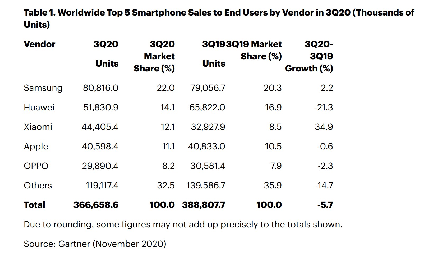 ตลาดสมาร์ตโฟนในไตรมาสที่สามของปี 2020 นั้นยอดขายรวมลดลง 5.7% เมื่อเทียบกับช่วงเวลาเดียวกันของปีก่อน แต่ยอดขายนั้นถือว่าดีขึ้นเมื่อเทียบกับครึ่งปีแรกที่เจอสถานการณ์ COVID-19 ที่เริ่มมีการคลายล็อกและผู้คนกลับมาใช้ชีวิตตามปกติมากขึ้น