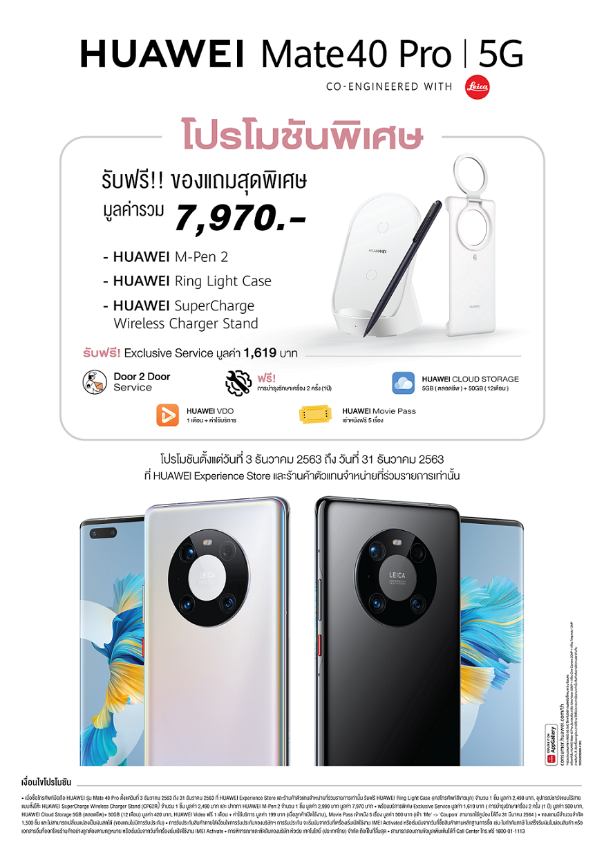 พิเศษสุดสำหรับผู้ที่ซื้อระหว่างวันที่ 3 – 31 ธันวาคม 2563 ผ่านทางหน้าร้าน HUAWEI Experience Store ทุกสาขา และเว็บไซต์ HUAWEI Online Store โฉมใหม่ รวมถึงร้านค้าและตัวแทนจำหน่ายที่ร่วมรายการทั่วประเทศ รับฟรีทันทีของสมนาคุณมูลค่ารวม 7,970 บาท ประกอบด้วย ปากกา HUAWEI M-Pen 2, เคสไฟวงแหวน HUAWEI Ring Light Case และแท่นชาร์จเร็วไร้สาย HUAWEI SuperChargeTM Wireless Charger Stand