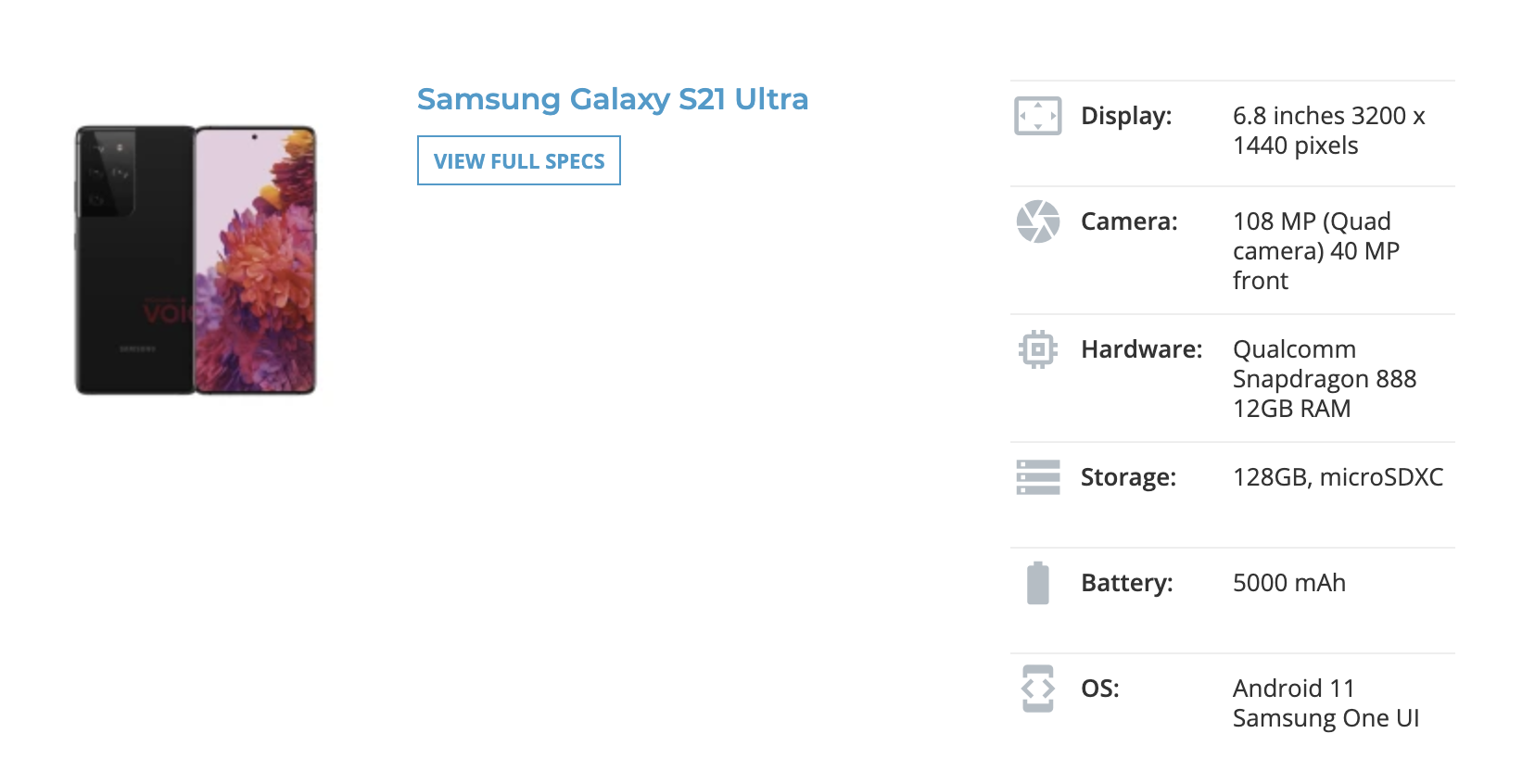 Galaxy S21 Ultra จะเป็นสมาร์ตโฟนรุ่นแรกที่เปิดตัวในต้นปี ซึ่งคาดว่าน่าจะมาพร้อมกับกล้องใหม่ อาจจะมาพร้อมกล้องหลักความละเอียด 108 ล้านพิกเซล และกล้องเลนส์มุมกว้างพิเศษ 12 ล้านพิกเซล