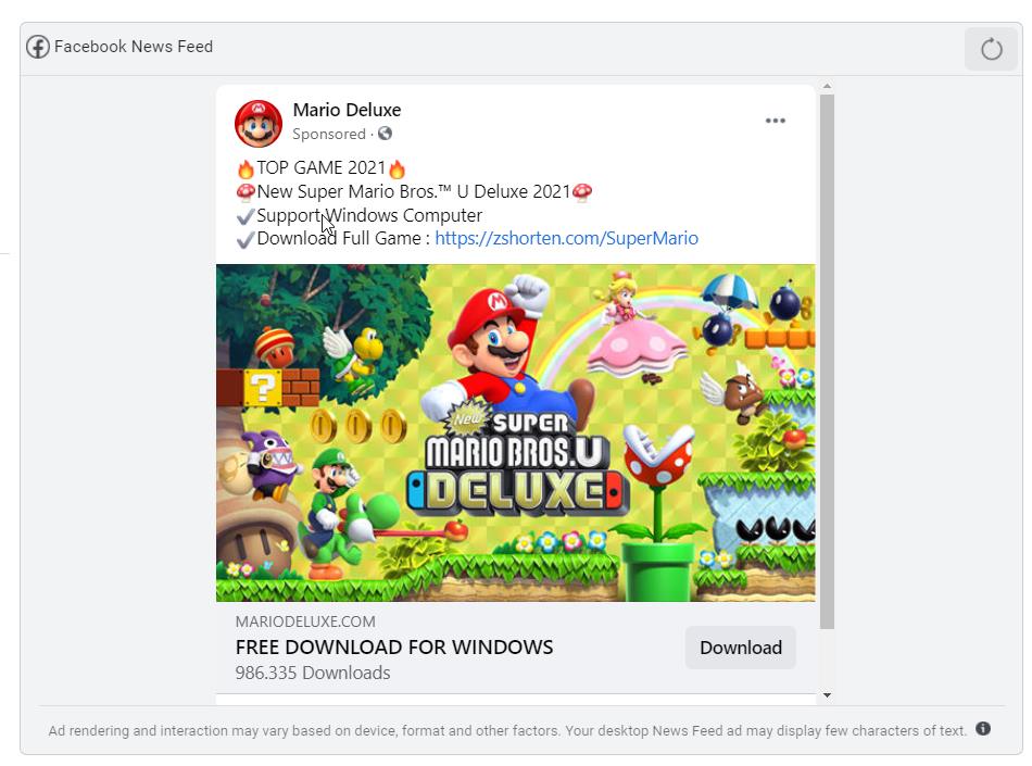 แฮกเกอร์ได้เข้ามาแฮกเพจโดยที่เจ้าของไม่รู้ตัว จากนั้นก็สวมรอยเป็นหนึ่งในแอดมินเพจ ทำการเปลี่ยนชื่อเพจใหม่เป็น “Mario Deluxe”แล้วสร้างโฆษณาเพจเพื่อดึงคนไปยังเว็บของตัวเองโดยที่ให้ไปเก็บเงินกับบัญชีเจ้าของเพจตัวจริง