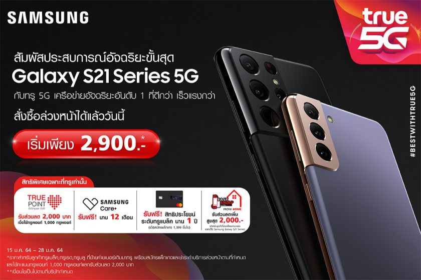ทรู 5G ส่งโปรสุดปัง…เอาใจสาวกซัมซุง เปิดจอง Samsung Galaxy S21 I S21+ I S21 Ultra 5G สมาร์ทโฟนเรือธงสุดล้ำแห่งปี พร้อมสัมผัสสุดยอดประสิทธิภาพการใช้งานบนเครือข่ายอัจฉริยะ ทรู 5G ที่เร็วกว่า แรงกว่า รายแรก รายเดียว ที่ครบสุดทุกย่านความถี่ เครือข่ายที่ดีที่สุดในประเทศไทยการันตีโดย nPerf 5 ปีซ้อน ในราคาที่ดีที่สุดที่เดียวเท่านั้น ! เริ่มต้นเพียง 2,900 บาท สำหรับลูกค้าทรูการ์ด ที่ย้ายค่ายเบอร์เดิม พร้อมสมัครแพ็กเกจและชำระค่าบริการล่วงหน้าตามที่กำหนด และใช้คะแนนทรูพอยท์ 1,000 ทรูพอยท์ แลกรับส่วนลด 2,000 บาท นอกจากนี้ยังจัดเต็มสิทธิพิเศษมากมาย อาทิ รับฟรี ! สิทธิประโยชน์ ระดับทรูแบล็ค นาน 1 ปี เมื่อซื้อเครื่องพร้อมแพ็กเกจ 1,399 บาท ขึ้นไป / ลูกค้าทรูแบล็ค รับคะแนนทรูพอยท์ 1,600 ทรูพอยท์ / ดูฟรี ! ทรูพรีเมียร์ลีก ตลอดฤดูกาล 2020/21 / รับฟรี ! Samsung Care+ นาน 12 เดือน / รับฟรี ! Galaxy Buds Pro มูลค่า 6,990 บาท / รับฟรี ! Galaxy Buds Live มูลค่า 5,990 บาท และอื่น ๆ อีกมากมาย