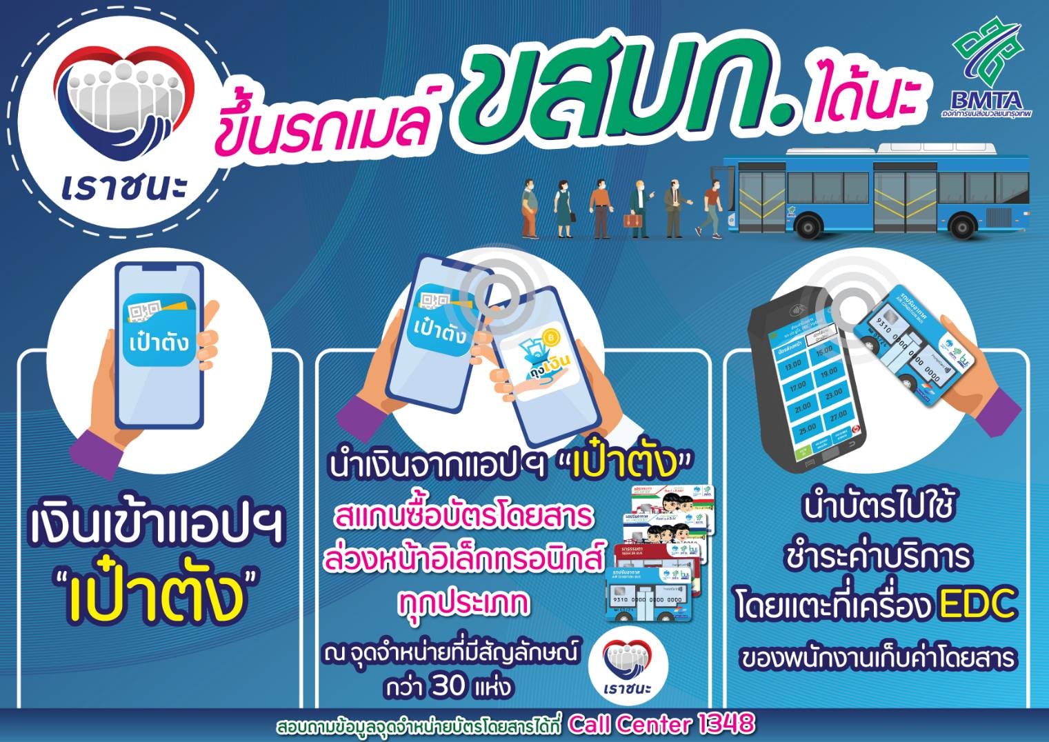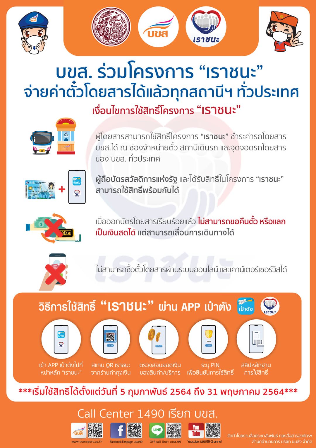 เราสามารถซื้อบัตรโดยสารล่วงหน้าอิเล็กทรอนิกส์ผ่านแอปพลิเคชัน “เป๋าตัง” ณ จุดจำหน่ายบัตรโดยสารที่มีสัญลักษณ์ “เราชนะ” กว่า 30 แห่งได้ตั้งแต่วันที่ 18 กุมภาพันธ์ – 31 พฤษภาคม 2564 เพื่อนำบัตรโดยสารดังกล่าว มาใช้ชำระค่าบริการบนรถโดยสารประจำทางของ ขสมก.