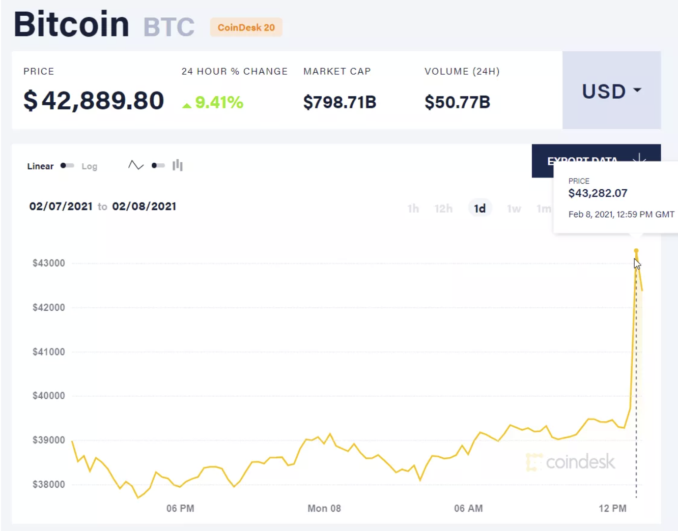 เมื่อข่าวการลงทุนครั้งนี้ถูกเผยแพร่ออกไป ส่งผลให้มูลค่าของบิทคอยน์พุ่งสูงขึ้นมากกว่า 43,000 ดอลลาร์ เรียกว่าทำสถิติสูงสุดเป็นประวัติการณ์ จากเดิมที่ค่อยๆเพิ่มขึ้นทีละน้อยตั้งแต่ต้นปีที่ผ่านมา