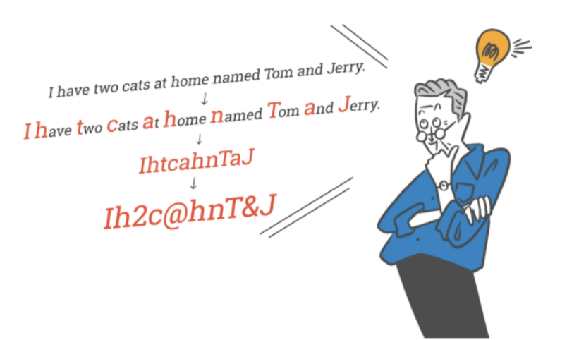 - ลองใช้ประโยคที่จำง่าย และใช้ตัวอักษรตัวแรกของแต่ละคำโดยใช้ตัวอักษรพิมพ์ใหญ่และพิมพ์เล็กตามความเหมาะสม หากเป็นไปได้ให้แทนที่ตัวอักษรด้วยตัวเลขหรือสัญลักษณ์