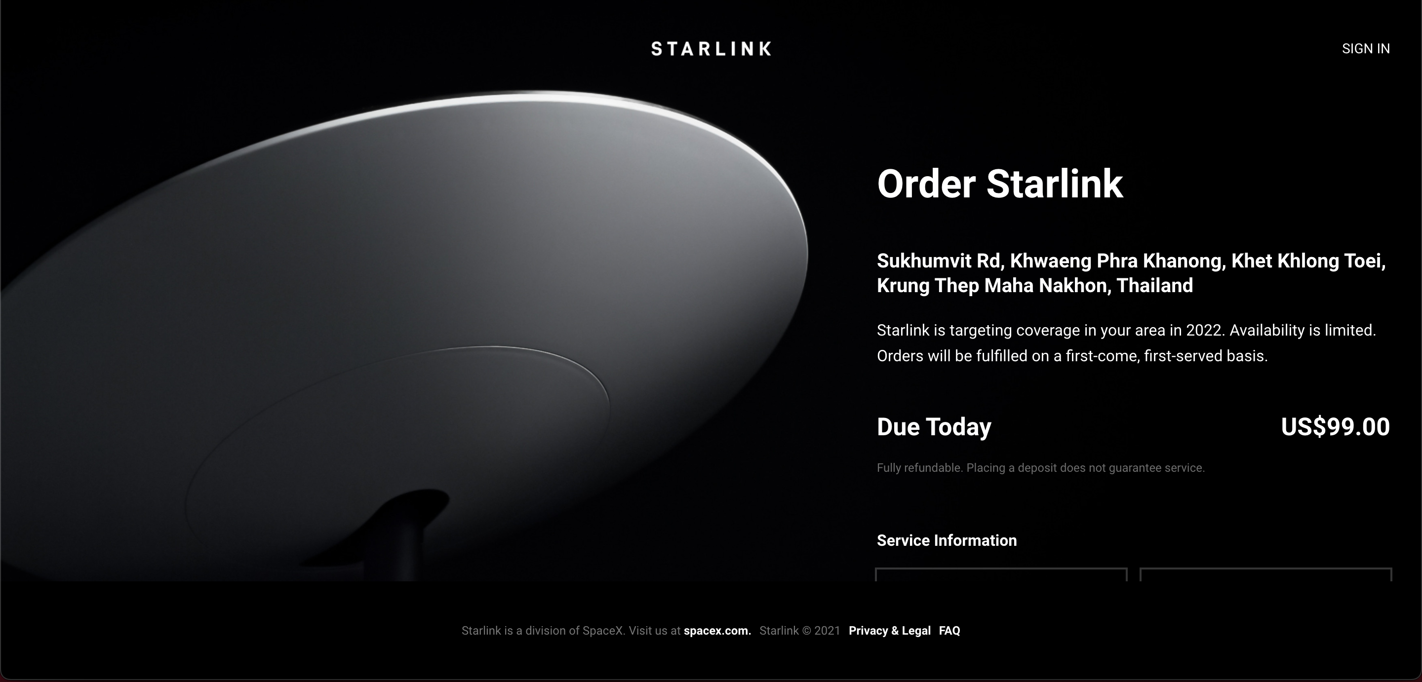 สิ่งที่เราต้องกรอกก็คือ อีเมลและพื้นที่ที่เราอยู่ เมื่อทดลองกรอกที่อยู่ในประเทศไทยก็พบว่าลงทะเบียนได้ แต่มีการแจ้งเตือนว่า บริการจะครอบคลุมในปี 2022 รวมถึงมีการจำกัดจำนวน ใครมาก่อนได้ใช้ก่อน
