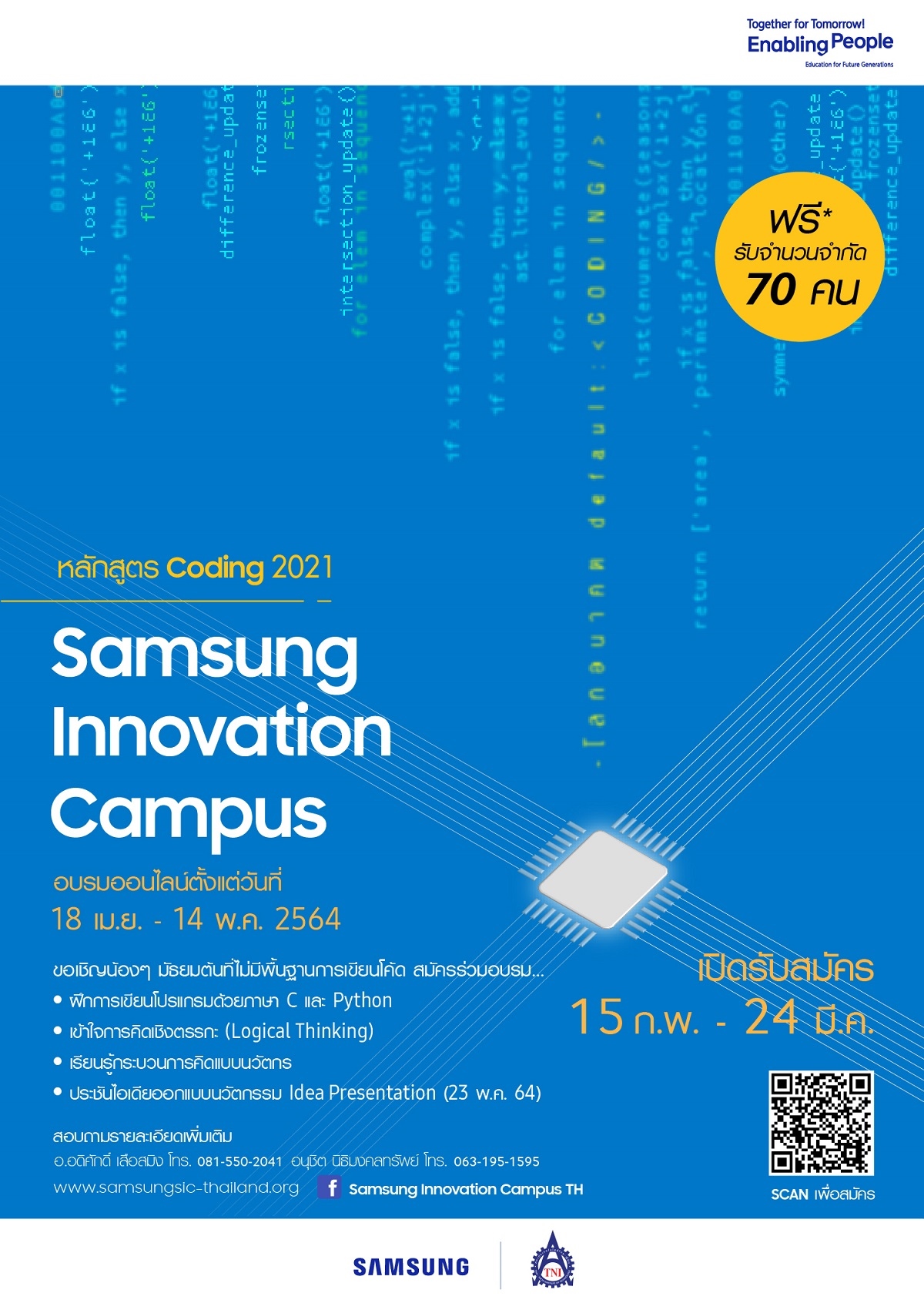 บริษัท ไทยซัมซุง อิเลคโทรนิคส์ จำกัด เชิญชวนนักเรียนที่กำลังจะขึ้นระดับชั้นมัธยมศึกษาปีที่ 2-3 เข้าร่วมการอบรมโค้ดดิ้งออนไลน์ในโครงการ Samsung Innovation Campus เพื่อเปิดประสบการณ์โลก Programming ฝึกเขียนโปรแกรมด้วยภาษา C และ ภาษาไพธอน (Python) เรียนรู้การคิดเชิงตรรกะและกระบวนการคิดแบบนวัตกร พร้อมประชันไอเดียออกแบบนวัตกรรมในกิจกรรม Idea Presentation