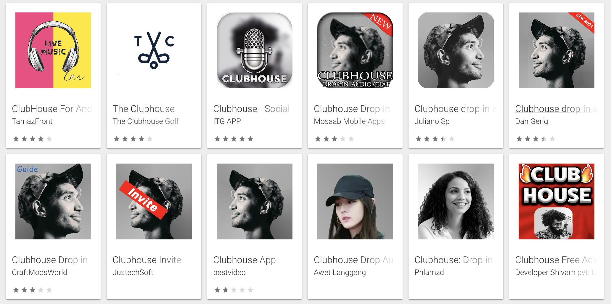 หลังจากที่แอป Clubhouse กลายเป็นกระแสทั่วโลกซึ่งสามารถใช้งานได้เฉพาะบน iOS เท่านั้น ทำให้เกิดแอปปลอมขึ้นมาหลายแอปใน Play Store ขึ้นหลายแอป จนผู้เชี่ยวชาญต้องออกมาเตือนให้ระวังการหลอกขโมยข้อมูล