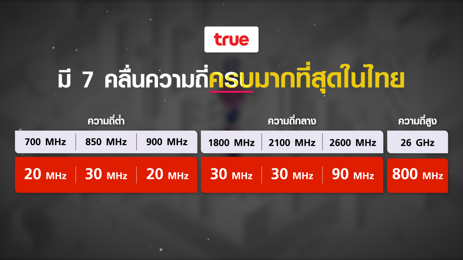 ในเครื่องของความครบ คือ มีคลื่นความถี่ที่ใช้ในการประกอบกิจการทั้งหมด 7 ย่านความถี่ทั้งความถี่ สูง กลาง และต่ำ อันได้แก่ คลื่นความถี่ย่าน 700 MHz, 850 MHz, 900 MHz, 1800 MHz, 2100 MHz, 2600 MHz และ 26 GHz ทำให้ ทรูมูฟ เอช มีคลื่นความถี่ย่านต่าง ๆ มากกว่าแบรนด์อื่นในตลาด ปรากฏตามภาพจึงถือได้ว่าเป็นรายแรก รายเดียว ที่มีคลื่นความถี่ครบ 7 ย่านความถี่มากที่สุดและครบที่สุดในไทยทำให้ทรูมูฟ เอชสามารถให้บริการได้ครบและตอบโจทย์ทุกดิจิทัลไลฟ์สไตล์ได้ลงตัว และ ทรูมูฟ เอช ยังคงมุ่งมั่นที่จะขยายโครงข่ายเพื่อให้มีสัญญาณครอบคลุมทั่วถึงทั้ง 77 จังหวัดทั่วไทย