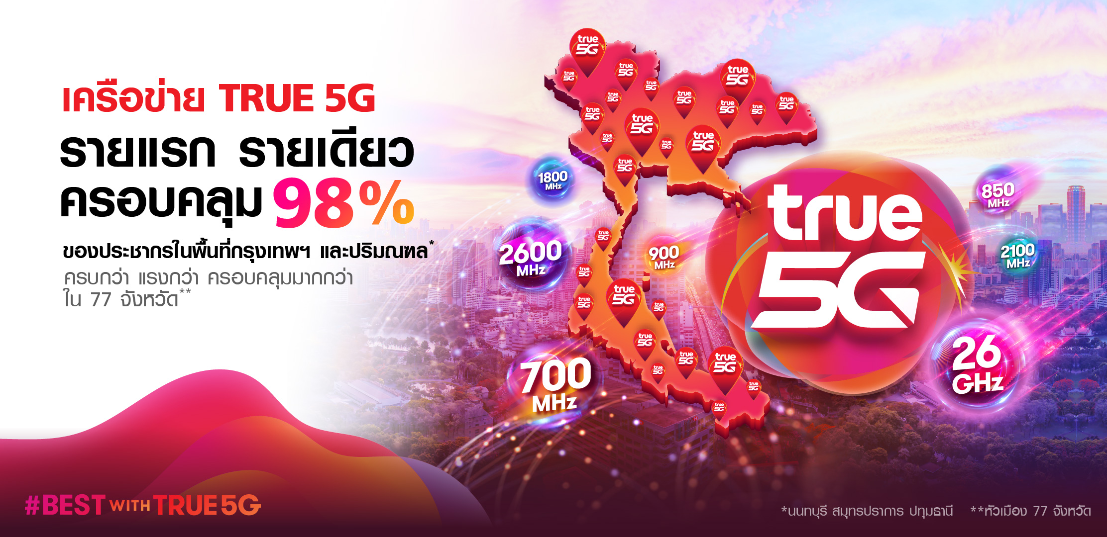 TRUE 5G ประกาศความสำเร็จ ขยายเครือข่าย 5G ครอบคลุมประชากรในกรุงเทพและปริมณฑลกว่า 98% ส่วนหัวเมืองต่างจังหวัดครอบคลุมใน 77 จังหวัดทั่วไทย