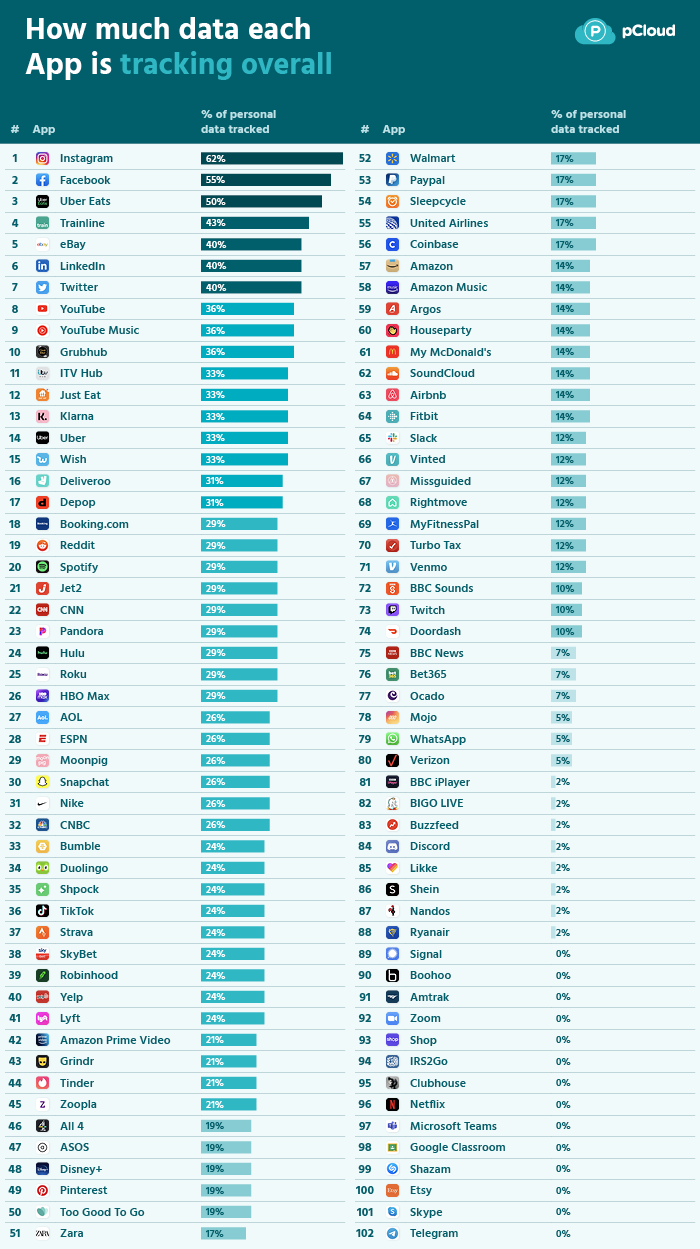 - Instagram (62% ของข้อมูลส่วนตัวที่ติดตาม)