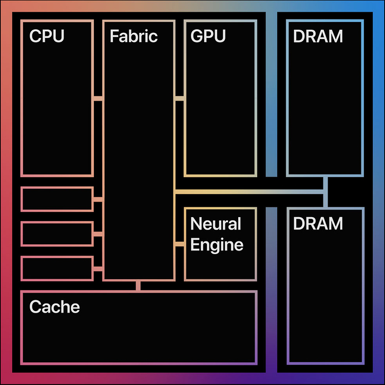 สำหรับ M1 นั้นในส่วน CPU ประกอบด้วย 8 แกนประมวลผล (core) โดยแบ่งเป็น 4 performance cores และ 4 efficiency cores ซึ่งจะถูกใช้งานเฉพาะช่วงที่ต้องการพลังการประมวลผลเพื่อให้ได้ประสิทธิภาพสูงสุด มาพร้อมกับ Unified Random Access Memory (RAM) ทำให้การรับส่งข้อมูลเร็วฟ้าผ่า