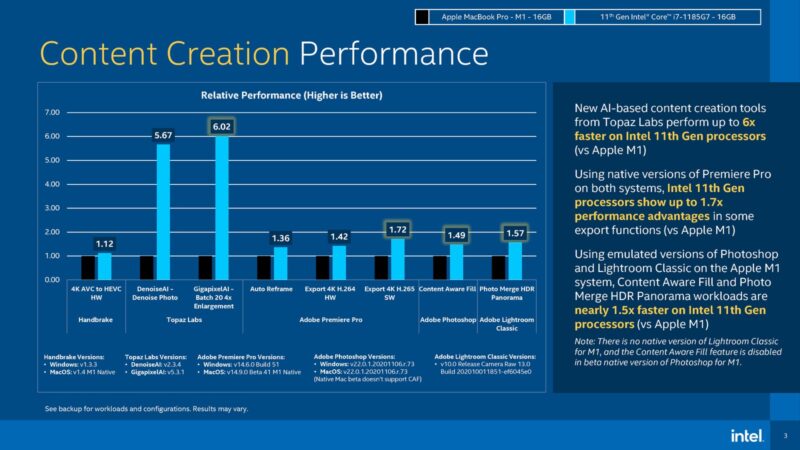 อย่างการที่นำ CPU รุ่นที่แรงที่สุดของ Intel มาชนกับ MacBook ในการทดสอบประสิทธิภาพและเน้นการใช้งานที่เฉพาะเจาะจงบางอย่าง เช่น Intel ระบุว่า software การขยายภาพที่ใช้ AI ของ Topaz Labs Gigapixel AI นั้นทำงานได้เร็วขึ้นถึง 6 เท่าบนโปรเซสเซอร์ Core i7 Gen 11 เมื่อเทียบกับชิป M1 บน MacBook Pro รุ่น 13 นิ้ว ซึ่งก็แน่นอนเพราะ Software ของ Topaz Labs นั้นได้รับการออกแบบมาเพื่อใช้ประโยชน์จากการเร่งฮาร์ดแวร์ภายในโปรเซสเซอร์ของ Intel