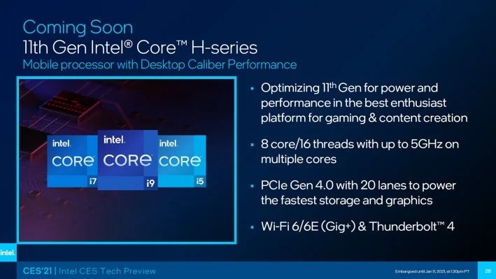 จากผลการทดสอบเทียบ CPU ของ Intel Gen 11 เทียบกับ CPU M1 ข้างต้นนั้นยังเป็นตัว Tiger Lake-U แต่เมื่อต้นเดือนมกราคมที่ผ่านมา Intel ได้เปิดตัวชิป Tiger Lake-H สำหรับคอมพิวเตอร์โน้ตบุ๊กรุ่นใหม่ ที่เกิดมาเพื่อโน้ตบุ๊กสายเกมโดยเฉพาะ โดยเป็นชิปที่ต่อยอดมาจาก Intel Tiger Lake Gen 11 U Series ที่เปิดตัวไปเมื่อปีที่แล้ว แพ็กคู่มากับชิปกราฟิก(GPU) สถาปัตยกรรม Xe ตัวแรง