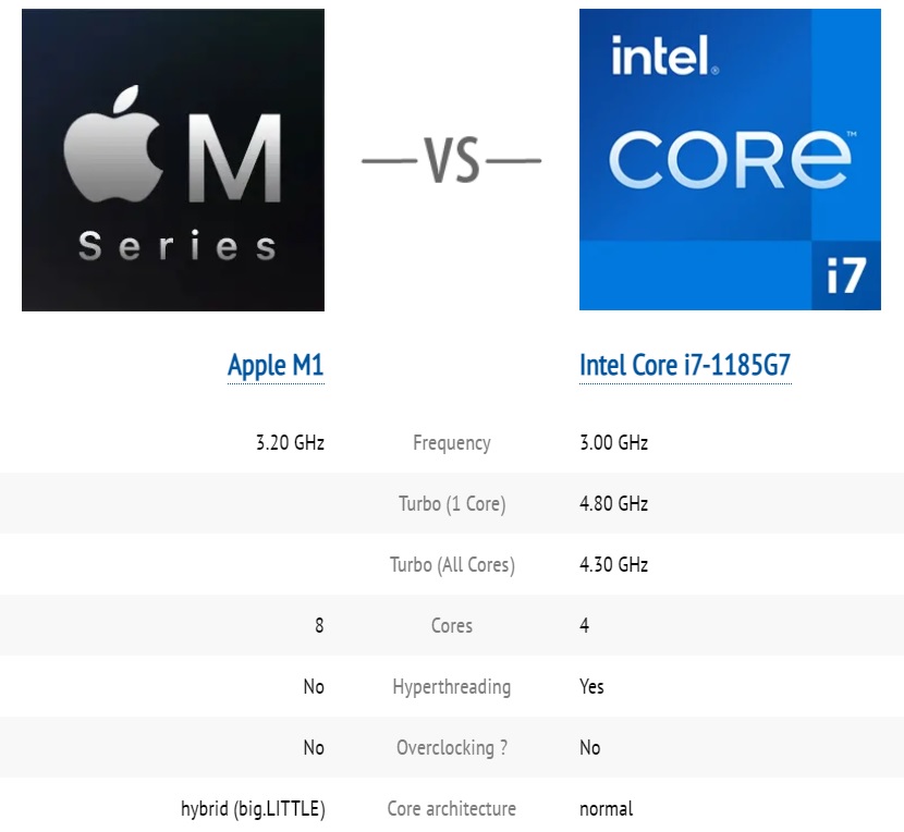 *จากรูป: เปรียบเทียบ Spec ของ M1 และ i7 Gen 11 ในปัจจุบัน*