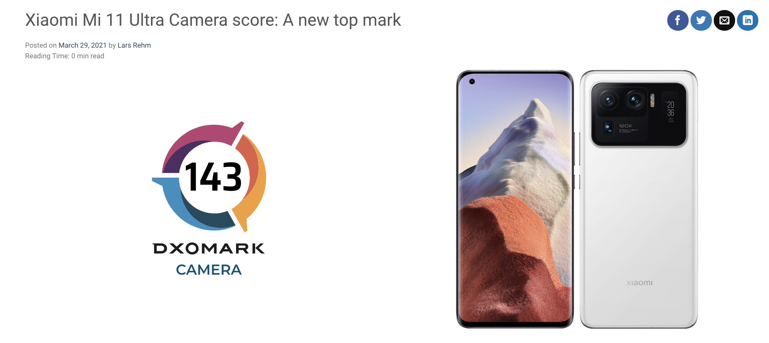 Mi 11 Ultra นับว่าเป็นก้าวสำคัญของเทคโนโลยีการถ่ายภาพและวิดีโอด้วยสมาร์ตโฟนต่อจากสมาร์ตโฟนรุ่นก่อนหน้าอย่าง Mi 10 Ultra สมาร์ตโฟนรุ่น Mi 11 Ultra มาพร้อมกับนวัตกรรมกล้องที่ดีที่สุดของเสียวหมี่ส่งผลให้ทำคะแนนบน DxOMark ไปถึง 143 คะแนน
