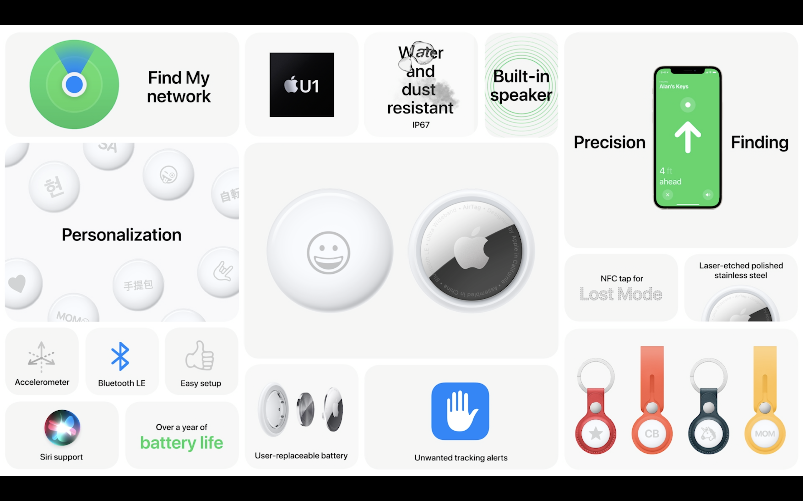 เมื่อทำงานร่วมกับชิป U1 บน iPhone 12 ทำให้ใช้ประโยชน์จากเทคโนโลยี UWB บอกพิกัดได้แม่นยำยิ่งขึ้นด้วยฟีเจอร์ Precision Finding ใช้กล้องและ Accerameter บนไอโฟนโชว์ลูกศรบนหน้าจอ นำทางไปยังของที่ต้องการ