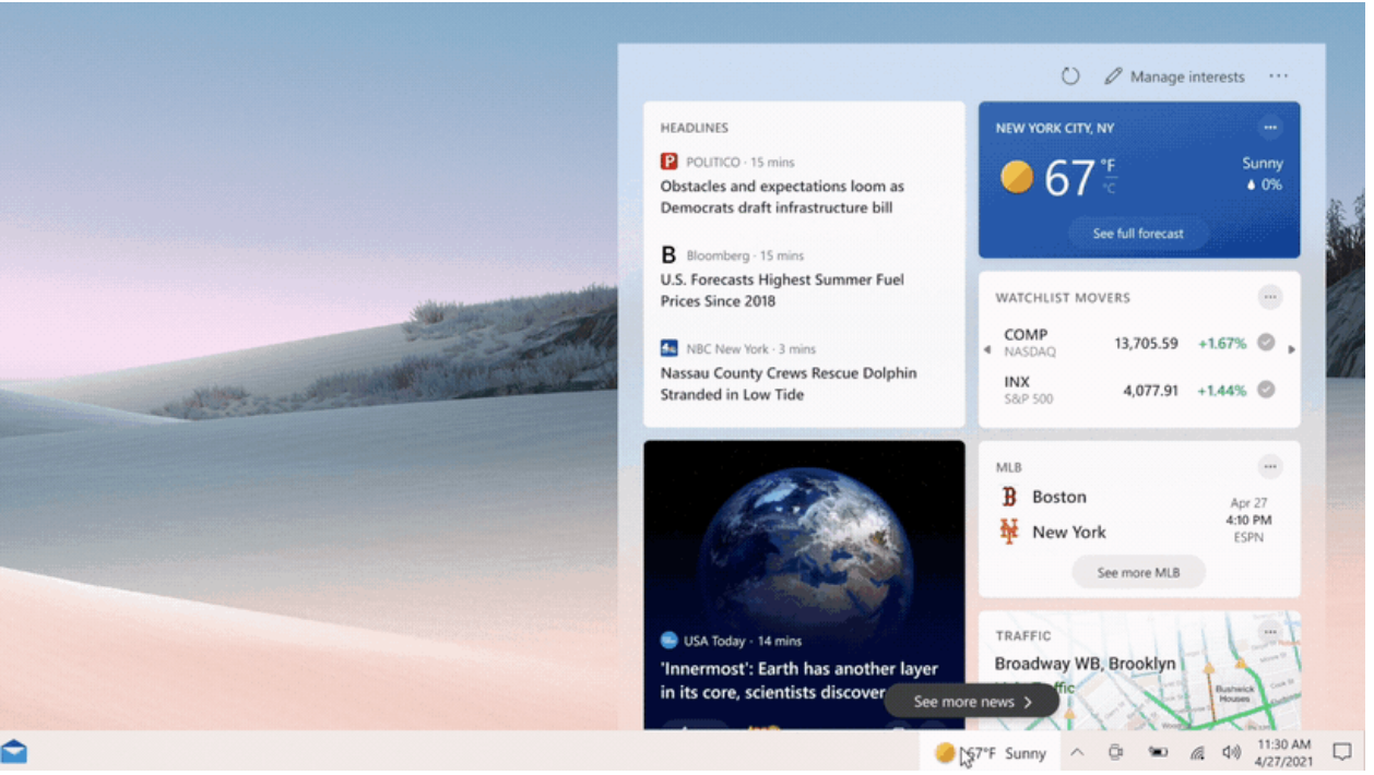 ที่สำคัญเราไม่จำเป็นต้องเอาเคอร์เซอร์ไปคลิกแอปเพื่อเปิดดู เพียงแค่เลื่อนเคอร์เซอร์ไปวางลงบนฮับใหม่บน Taskbar ก็จะมีข่าวสารและข้อมูลแบบ Real-time ขึ้นมา โดยจะปรากฎในรูปแบบของการ์ด รวบรวมสิ่งที่เราสนใจเอาไว้ ไม่ว่าเป็นข่าวเด่น, พยากรณ์อากาศ, หุ้น, รายงานสภาพจราจรและผลกีฬา ช่วยให้เราได้ข้อมูลทันเหตุการณ์เร็วขึ้น