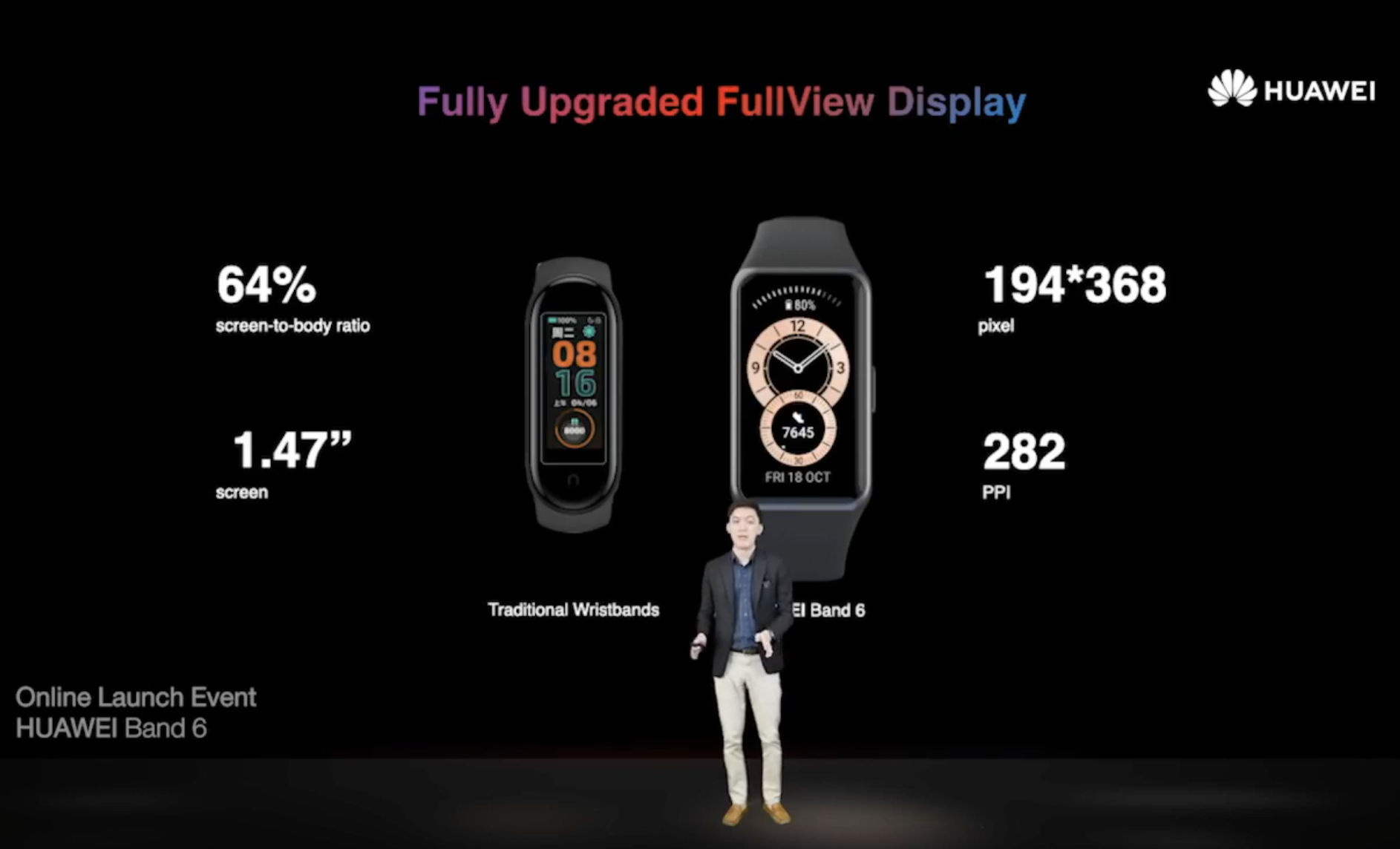 HUAWEI Band 6 มาพร้อมกับหน้าจอ AMOLED 1.47 นิ้ว (194 x 368 พิเซล) 282 PPI อัตราส่วนหน้าจอเพิ่มขึ้น 42% สามารถดาวน์โหลดหน้าปัดเพิ่มได้มากกว่าพันรูปแบบ