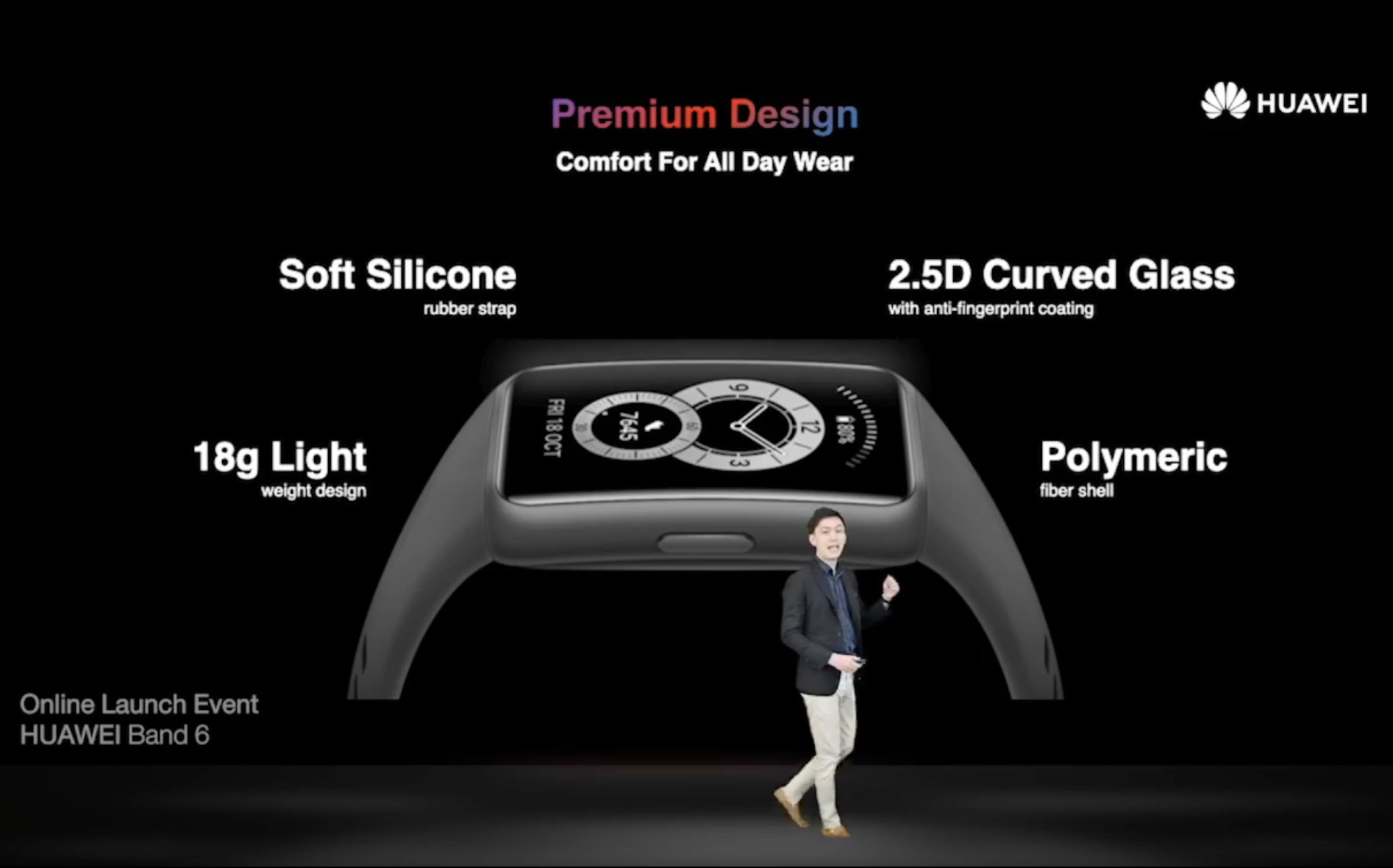 HUAWEI ยังชูจุดเด่นในเรื่องของ Premium Design หน้าจอโค้ง 2.5D ตัวกรอบทำมาจากไฟเบอร์ทนต่อแรงกระแทกได้ดี สวมใส่สบายตลอดทั้งวัน ด้วยสวยที่ทำจากซิลิโคน น้ำหนักตัวเครื่องเพียง 18 กรัมเท่านั้น