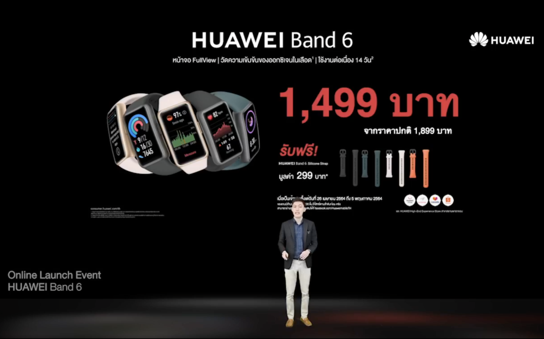 สำหรับราคาของ HUAWEI Band 6 เปิดตัวมาที่ 1,899 บาท และถ้าใครพรีออเดอร์ ตั้งแต่วันนี้ตนถึง 5 พฤษภาคม จะซื้อได้ราคาพิเศษ 1,499 บาท พร้อมสายเพิ่มอีกหนึ่งสาย