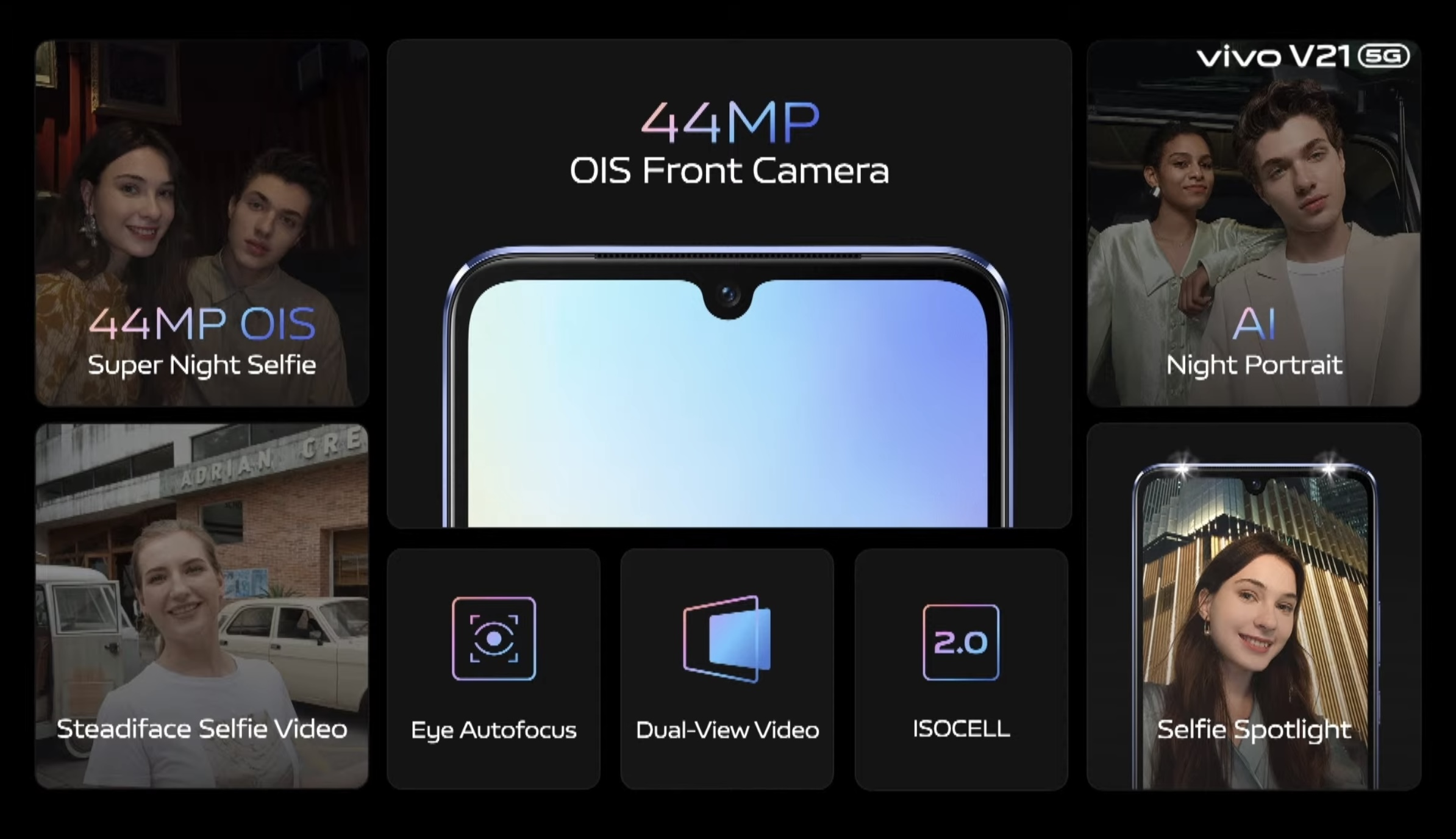 กล้องหน้าของ vivo V20 ถือว่าจัดเต็มเป็นอย่างมาก เพราะให้ความละเอียดมาถึง 44MP ตัวแรกของโลกที่มีกันสั่น OIS มาให้ เมื่อทำงานร่วมกับ EIS ทำให้วิดีโอที่ได้มามีความนิ่งมากยิ่งขึ้น แถมมี AI Night Portrait มาให้ ถ้ายรูกลางคืนได้เป็นอย่างดี และถ้าคิดว่ายังไม่พอ เค้าก็มี Selfie Sportlight มาให้ จะมีไฟ Sportlight ที่ขอบด้านบนกล้องไป 2 ตัว ทำให้ถ่ายภาพออกมาได้มีคุณภาพมากยิ่งขึ้น