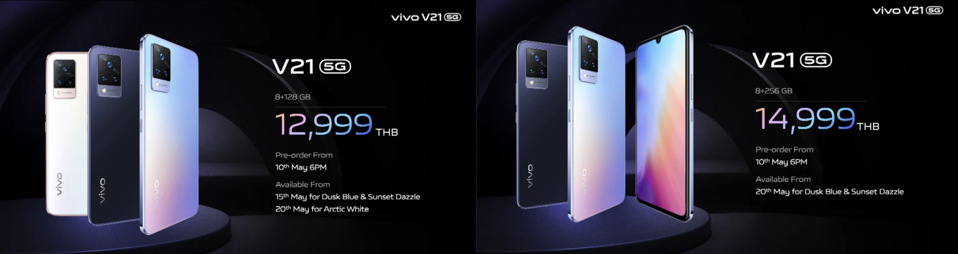 สำหรับใครที่สนใจ vivo V21 5G มีให้เลือก 3 สี คือ Dusk Blue, Sunset Dazzle และ Arctic White ในตัว แรม 8GB ความจุ 128GB ราคา 12,999 บาท และ รม 8GB ความจุ 256GB ราคา 14,999 บาท เริ่มพรีออเดอร์ 10 พฤษภาคมนี้ 6โมงเย็นเป็นต้นไป