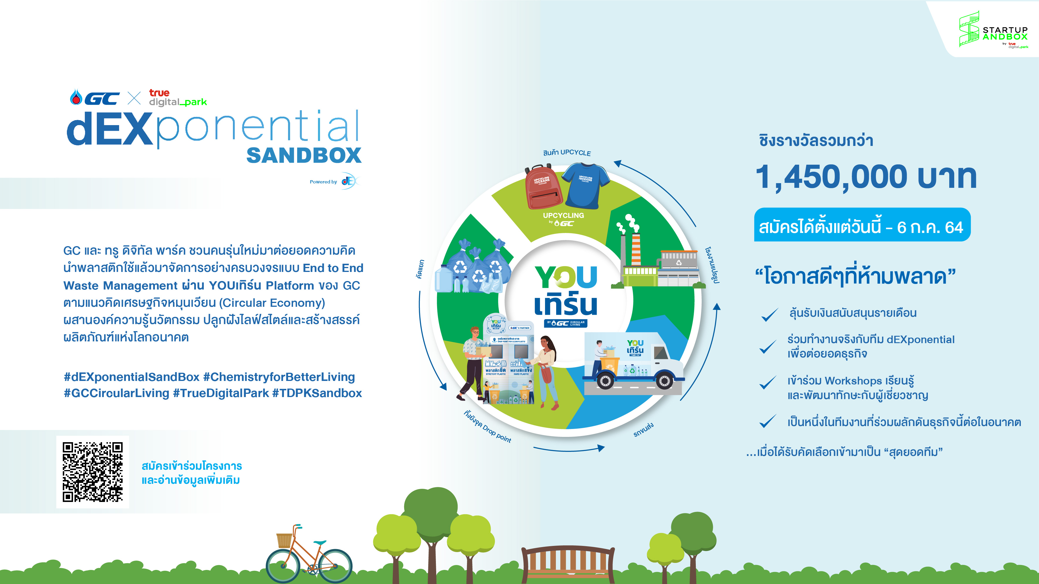 ไม่ต้องห่วงค่ะ โอกาสของคุณมาแล้วค่ะกับโปรแกรม dEXponential Sandbox ที่ต่อยอด “โครงการ You เทิร์น” พลาสติกคืนสุข ที่ต้องการแก้ปัญหาขยะพลาสติกด้วยการหลักเศรษฐกิจหมุนเวียน (Circular Economy) นำนวัตกรรมามาช่วยให้การจัดการขยะพลาสติกได้มีประสิทธิภาพมากขึ้น รวมถึงสร้างมูลค่าเพิ่มให้กับขยะพลาสติกที่นำกลับมาใช้ซ้ำได้