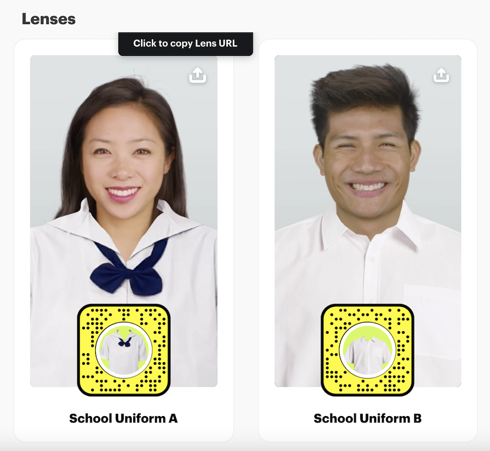 การใช้งานนั้นเราจะต้องโหลดแอป Snap Camera มาใช้งานก่อน ที่นี่ เมื่อติดตั้งเรียบร้อยแล้ว ให้เราเข้าไปโหลดชุดนักเรียนได้ที่ shorturl.at/dtALS ให้กดที่ไอคอนที่อยู่มุมขวาบนของชุด เพื่อทำการกดก็อปลิงก์ชุดนักเรียน