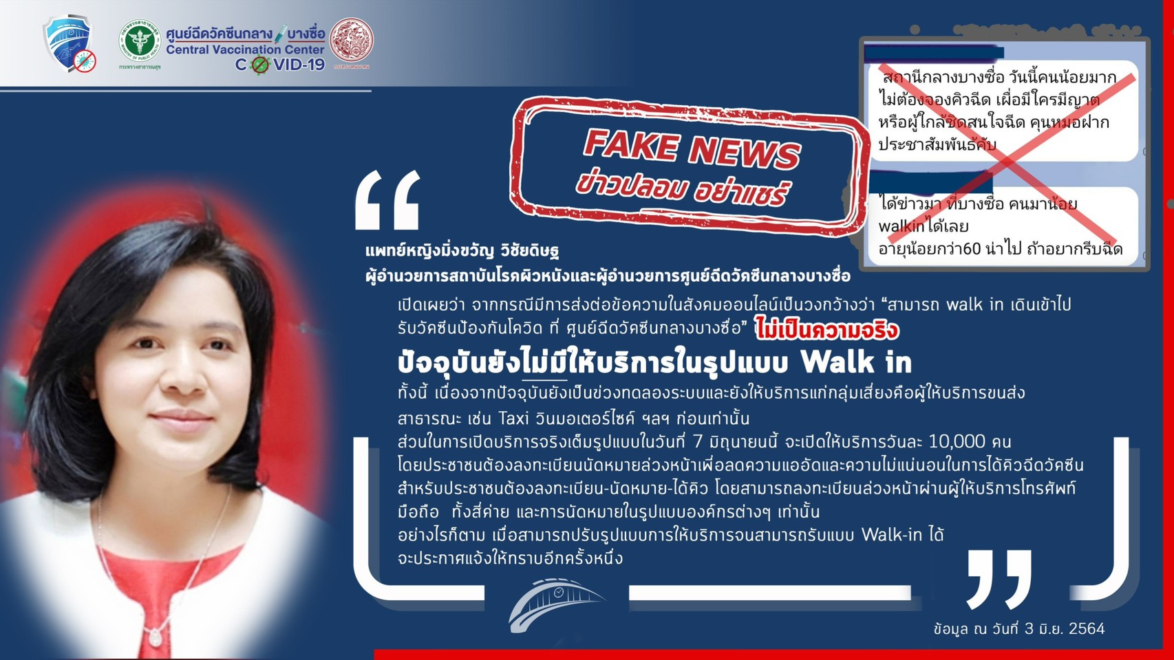 แพทย์หญิงมิ่งขวัญ วิชัยดิษฐ ผู้อำนวยการสถาบันโรคผิวหนังและผู้อำนวยการศูนย์ฉีดวัคซีนกลางบางซื่อ เปิดเผยว่า จากกรณีมีการส่งต่อข้อความในสังคมออนไลน์เป็นวงกว้างว่า “สามารถ walk in เดินเข้าไปรับวัคซีนป้องกันโควิด ที่ ศูนย์ฉีดวัคซีนกลางบางซื่อ” นั้น ไม่เป็นความจริง