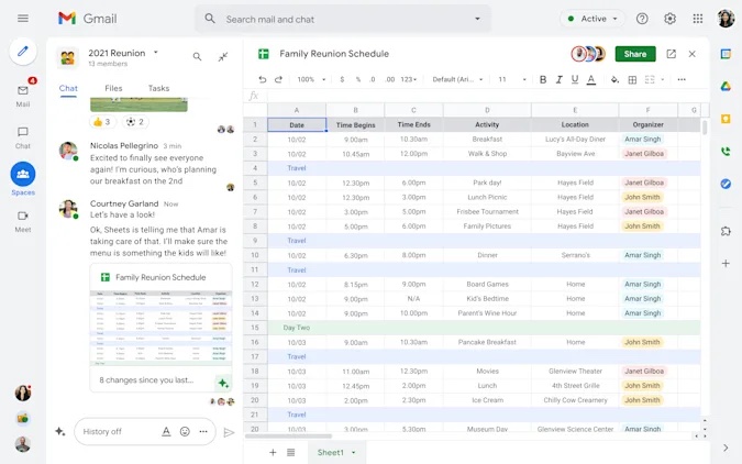 จากภาพด้านบนเราจะเห็น Spaces หน้าตากเป็นอย่างไร มีการแบ่งหน้าจอด้านซ้ายสำหรับแชทกับเพื่อนร่วมงาน ส่วนด้านขวาจะเป็น Google Sheet ให้ทำงานร่วมกัน โดยในหร้าต่างแชทเราสามารถเปลี่ยนดูไฟลืหรืองานที่ทำได้ รวมถึงเปลี่ยกลุ่มทำงานจากเมนูด้านบน
