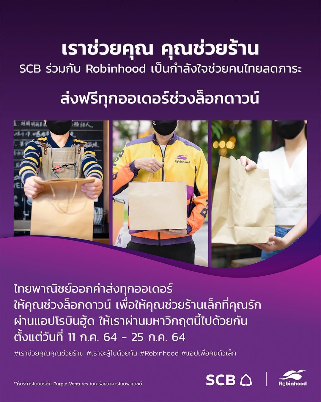 “ธนาคารไทยพาณิชย์” ตระหนักถึงความกังวลและความเดือดร้อนของสังคมไทยที่มีต่อสถานการณ์การแพร่ระบาดของโควิด-19 ที่กำลังทวีความเข้มข้น จึงได้ร่วมกับ “โรบินฮู้ด” แพลตฟอร์มฟู้ดเดลิเวอรีสัญชาติไทย ในเครือธนาคารฯ ออกมาตรการพิเศษ “ส่งฟรีทุกออเดอร์ช่วงล็อกดาวน์” ตั้งแต่วันที่ 11 – 25 กรกฎาคม 2564 รวม 15 วัน เพื่อช่วยบรรเทาความเดือดร้อนของผู้คนในสังคม ช่วยลดภาระค่าใช้จ่ายให้กับลูกค้าด้วยการออกค่าส่งอาหารให้ฟรีทุกออเดอร์ มุ่งหวังช่วยร้านอาหารโดยเฉพาะร้านเล็ก ๆ ให้มีออเดอร์มีรายได้ในการพยุงธุรกิจ รวมถึงเพิ่มโอกาสในการสร้างงานที่เพิ่มขึ้นให้กับไรเดอร์ หวังให้มาตรการพิเศษในครั้งนี้ จะเป็นจุดเริ่มต้นของโมเดลที่ “คนตัวใหญ่” จะสามารถมีส่วนช่วยเหลือสังคมและต่อลมหายใจให้ “คนตัวเล็ก” สามารถผ่านพ้นช่วงเวลาที่ยากลำบากได้อีกครั้ง