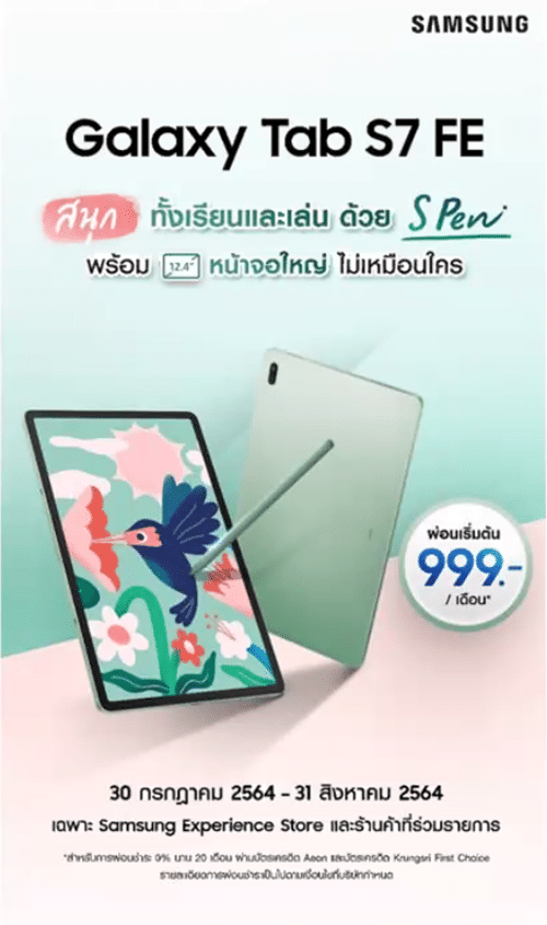 สำหรับ Galaxy Tab S7 FE มีให้เลือก 4 สี คือ เขียว ชมพู เงิน ดำ ราคารุ่น LTE 19,990 บาท วางขายพร้อมกับ Book Cover ราคา 2,990 บาท และ Keyboard Cover ราคา 4,990 บาท